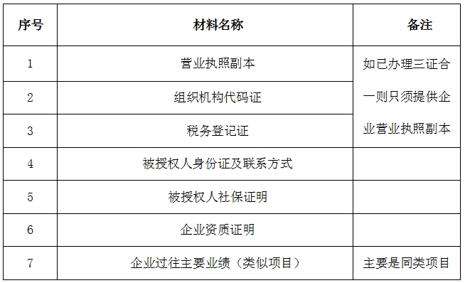 2、 凡有意向參加投標(biāo)者,請(qǐng)?jiān)谏鲜銎陂g內(nèi)按下表提供報(bào)名資料,相關(guān)證明文件的原件如無(wú)法提供原件則提供復(fù)印件加蓋公司公章,投標(biāo)人須將上述資料的掃描件發(fā)郵件至招標(biāo)聯(lián)系人處進(jìn)行報(bào)名。