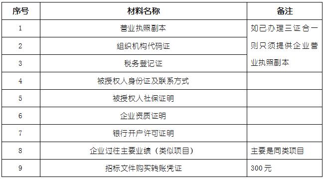 2、 凡有意向參加投標(biāo)者,請在上述期間內(nèi)按下表提供報名資料,相關(guān)證明文件的原件如無法提供原件則提供復(fù)印件加蓋公司公章,投標(biāo)人須將上述資料的掃描件發(fā)郵件至招標(biāo)聯(lián)系人處進(jìn)行報名。