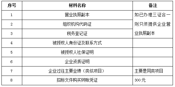 2、 凡有意向參加投標(biāo)者,請?jiān)谏鲜銎陂g內(nèi)按下表提供報(bào)名資料,相關(guān)證明文件的原件如無法提供原件則提供復(fù)印件加蓋公司公章,投標(biāo)人須將上述資料的掃描件發(fā)郵件至招標(biāo)聯(lián)系人處進(jìn)行報(bào)名。