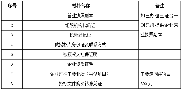 2、 凡有意向參加投標(biāo)者,請(qǐng)?jiān)谏鲜銎陂g內(nèi)按下表提供報(bào)名資料,相關(guān)證明文件的原件如無法提供原件則提供復(fù)印件加蓋公司公章,投標(biāo)人須將上述資料的掃描件發(fā)郵件至招標(biāo)聯(lián)系人處進(jìn)行報(bào)名。
