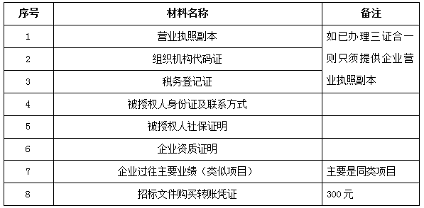2、 凡有意向參加投標(biāo)者,請?jiān)谏鲜銎陂g內(nèi)按下表提供報(bào)名資料,相關(guān)證明文件的原件如無法提供原件則提供復(fù)印件加蓋公司公章,投標(biāo)人須將上述資料的掃描件發(fā)郵件至招標(biāo)聯(lián)系人處進(jìn)行報(bào)名。