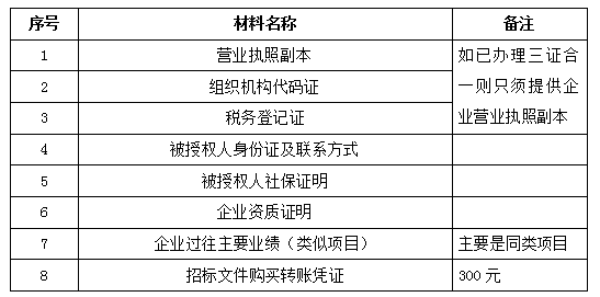 2、 凡有意向參加投標者,請在上述期間內(nèi)按下表提供報名資料,相關(guān)證明文件的原件如無法提供原件則提供復(fù)印件加蓋公司公章,投標人須將上述資料的掃描件發(fā)郵件至招標聯(lián)系人處進行報名。
