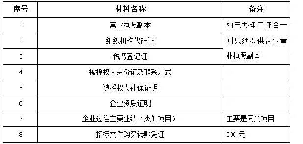 2、 凡有意向參加投標(biāo)者,請在上述期間內(nèi)按下表提供報名資料,相關(guān)證明文件的原件如無法提供原件則提供復(fù)印件加蓋公司公章,投標(biāo)人須將上述資料的掃描件發(fā)郵件至招標(biāo)聯(lián)系人處進(jìn)行報名。報名電子郵件:dyzb@cndare.com