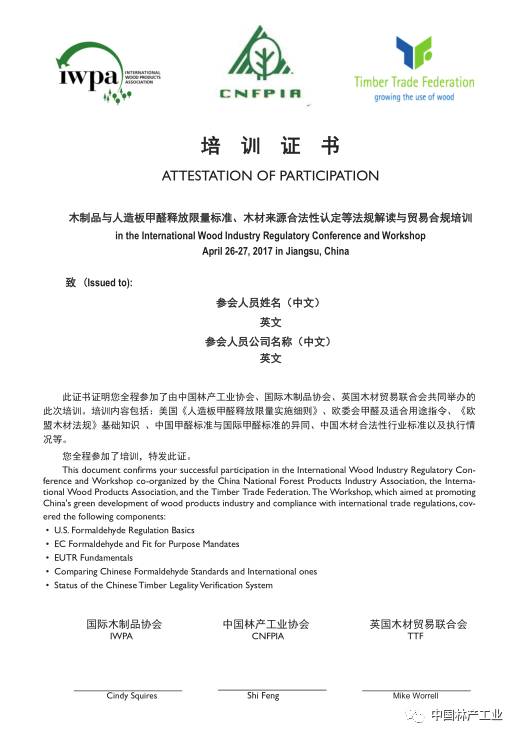 2017年4月26日-27日,由中國(guó)林產(chǎn)工業(yè)協(xié)會(huì)、美國(guó)國(guó)際木制品協(xié)會(huì)(IWPA)、英國(guó)木材貿(mào)易聯(lián)合會(huì)(TTF)聯(lián)合主辦,大亞人造板集團(tuán)有限公司、中國(guó)林產(chǎn)工業(yè)協(xié)會(huì)標(biāo)準(zhǔn)化技術(shù)委員會(huì)承辦的中國(guó)、美國(guó)、歐盟《人造板甲醛釋放限量》標(biāo)準(zhǔn)與木材合法性法規(guī)研修班在江蘇省丹陽(yáng)市隆重召開(kāi),來(lái)自大亞人造板集團(tuán)有限公司、南京林業(yè)大學(xué)、中國(guó)質(zhì)量認(rèn)證中心、中國(guó)合格評(píng)定國(guó)家認(rèn)可中心、中國(guó)建材認(rèn)證、廣東產(chǎn)品質(zhì)量監(jiān)督檢驗(yàn)研究院、黑龍江省木材科學(xué)研究所、通標(biāo)標(biāo)準(zhǔn)技術(shù)服務(wù)有限公司、道和律師事務(wù)所等近百家的企事業(yè)單位,200余名代表參會(huì)。