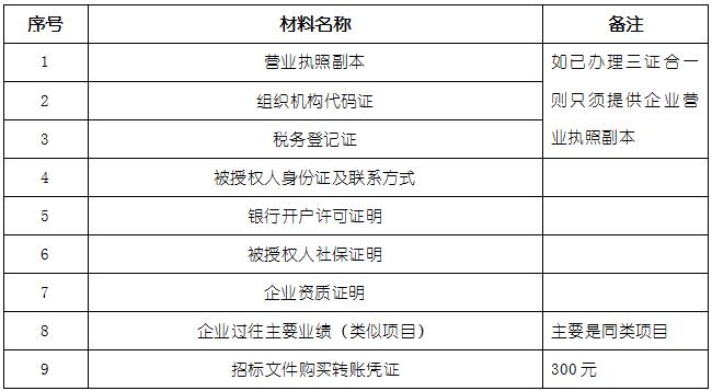 2、 凡有意向參加投標(biāo)者,請?jiān)谏鲜銎陂g內(nèi)按下表提供報(bào)名資料,相關(guān)證明文件的原件如無法提供原件則提供復(fù)印件加蓋公司公章,投標(biāo)人須將上述資料的掃描件發(fā)郵件至招標(biāo)聯(lián)系人處進(jìn)行報(bào)名。