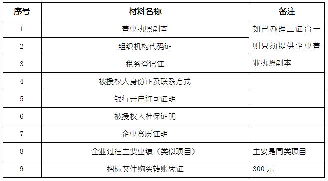 2、 凡有意向參加投標(biāo)者,請(qǐng)?jiān)谏鲜銎陂g內(nèi)按下表提供報(bào)名資料,相關(guān)證明文件的原件如無(wú)法提供原件則提供復(fù)印件加蓋公司公章,投標(biāo)人須將上述資料的掃描件發(fā)郵件至招標(biāo)聯(lián)系人處進(jìn)行報(bào)名。