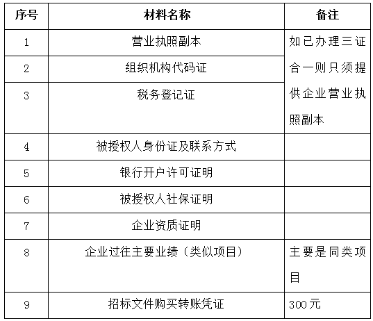 2、 凡有意向參加投標(biāo)者,請(qǐng)?jiān)谏鲜銎陂g內(nèi)按下表提供報(bào)名資料,相關(guān)證明文件的原件如無法提供原件則提供復(fù)印件加蓋公司公章,投標(biāo)人須將上述資料的掃描件發(fā)郵件至招標(biāo)聯(lián)系人處進(jìn)行報(bào)名。