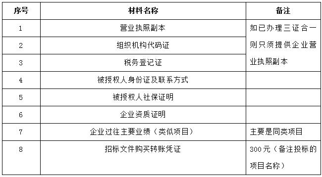 2、 凡有意向參加投標(biāo)者,請(qǐng)?jiān)谏鲜銎陂g內(nèi)按下表提供報(bào)名資料,相關(guān)證明文件的原件如無(wú)法提供原件則提供復(fù)印件加蓋公司公章,投標(biāo)人須將上述資料的掃描件發(fā)郵件至招標(biāo)聯(lián)系人處進(jìn)行報(bào)名。