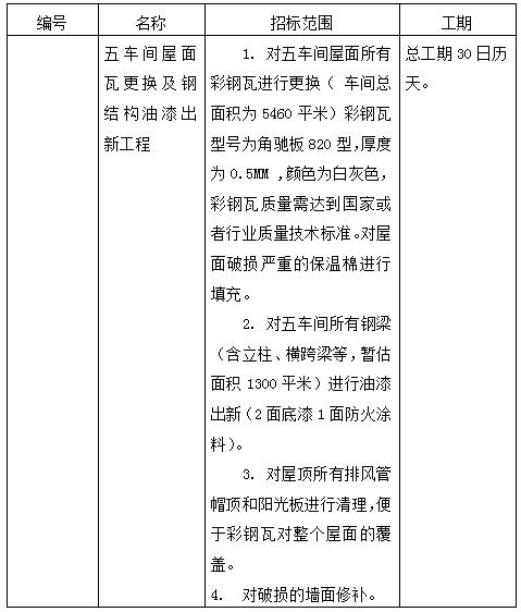 2、 工程規(guī)模: 彩鋼瓦進行更換車間總面積為5460平米,五車間所有鋼梁含立柱、橫跨梁等,暫估面積1300平米,進行油漆出新以及其他零星墻面修補。
