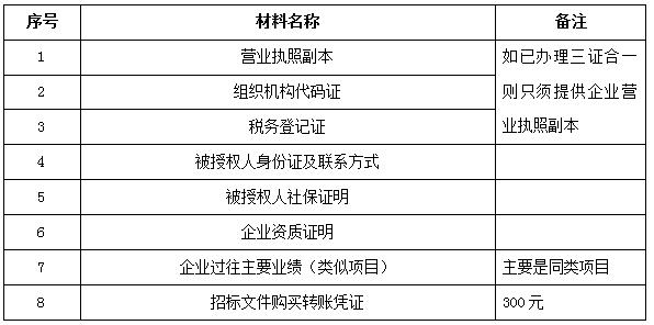 2、 凡有意向參加投標(biāo)者,請?jiān)谏鲜銎陂g內(nèi)按下表提供報名資料,相關(guān)證明文件的原件如無法提供原件則提供復(fù)印件加蓋公司公章,投標(biāo)人須將上述資料的掃描件發(fā)郵件至招標(biāo)聯(lián)系人處進(jìn)行報名。