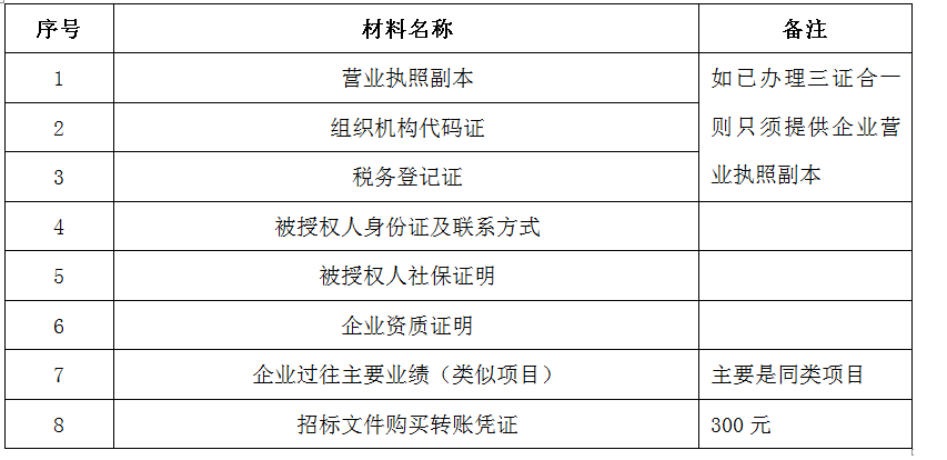 4、 獲取時間為本招標(biāo)公告截止后,由招標(biāo)人統(tǒng)一發(fā)放,本公告公示期間為:2020年9月28日12時起至2020年10月3日12時。凡有意向參加投標(biāo)者,請在上述期間內(nèi)按下表提供報名資料,相關(guān)證明文件的原件如無法提供原件則提供復(fù)印件加蓋公司公章,投標(biāo)人須將上述資料的掃描件發(fā)郵件至招標(biāo)聯(lián)系人處進(jìn)行報名。